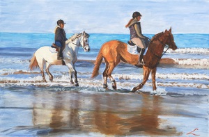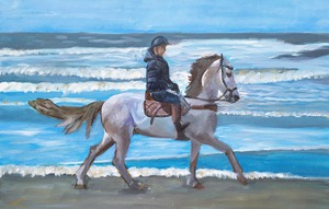 2023Op een schilderij is een meisje afgebeeld dat op een wit paard op een strand rijdt.