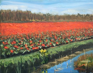 2025een olieverfschilderij met een uitgestrekt veld vol felrode bloemen