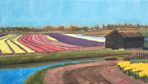 2025olieverfschilderij met een levendige scène van velden vol tulpen